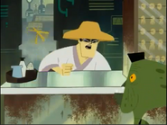 Jack is transformed into a chicken after bumping into a Cranky Wizard. Soon, he's discovered by a man who resembles the Scotsman, except being fat and shorter. Later, Jack enters an illegal combat arena and faces off against a robot beetle, similar to Aku's Beetle Drones.